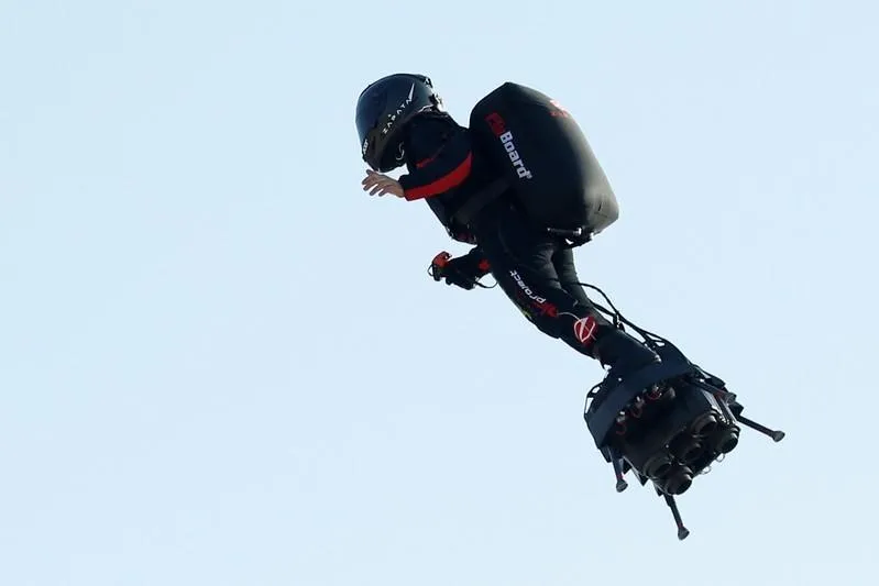صورة أرشيفية لمخترع فرنسي يستقل لوحاً طائراً نفاثاً من تصميمه (رويترز)