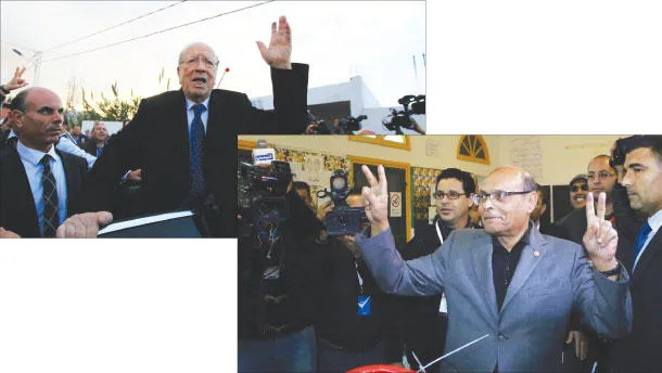 المرشح في انتخابات الرئاسة التونسية المنصف المرزوقي يلوح بإشارة النصر بعد إدلائه بصوته في سوسة أمس (إ.ب.أ) و الباجي قائد السبسي، رئيس حركة «نداء تونس» المرشح في الانتخابات الرئاسية التونسية التي جرت أمس، يحيي أنصاره بعد إدلائه بصوته في مركز اقتراع بتونس العاصمة أمس (رويترز)