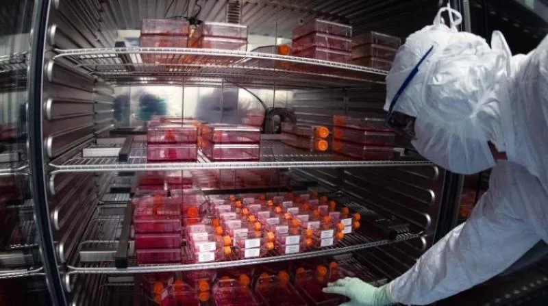 فني مختبر يرتدي معدات الحماية الشخصية وهو يأخذ زجاجات الكاشف لإجراء اختبارات اللقاح في مختبر سانوفي (أ.ف.ب)