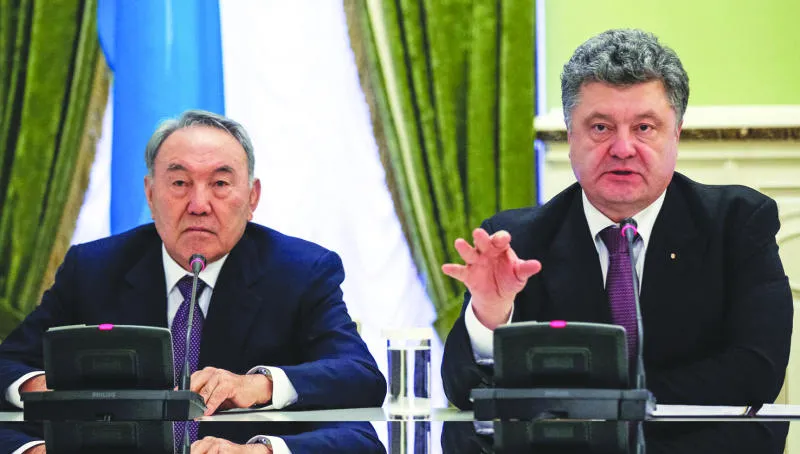 الرئيس الأوكراني بيترو بوروشينكو (يمين) مع ضيفه رئيس كازاخستان نور سلطان نزارباييف في المؤتمر الصحافي في العاصمة كييف أمس (إ.ب.أ)
