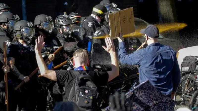 ضباط شرطة يستخدمون رذاذ الفلفل خلال اشتباكهم مع المتظاهرين في سياتل (أ.ف.ب)