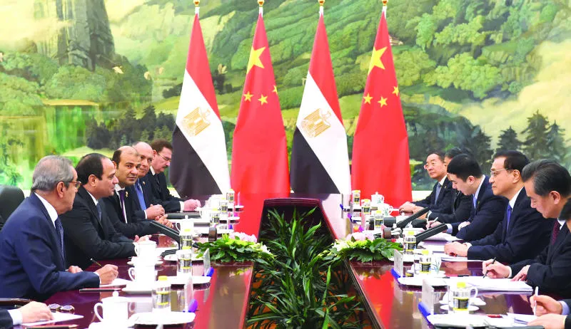 الرئيس المصري عبد الفتاح السيسي يتحدث إلى رئيس الوزراء الصيني أثناء جولة المباحثات بين البلدين في بكين أمس (أ. ب)