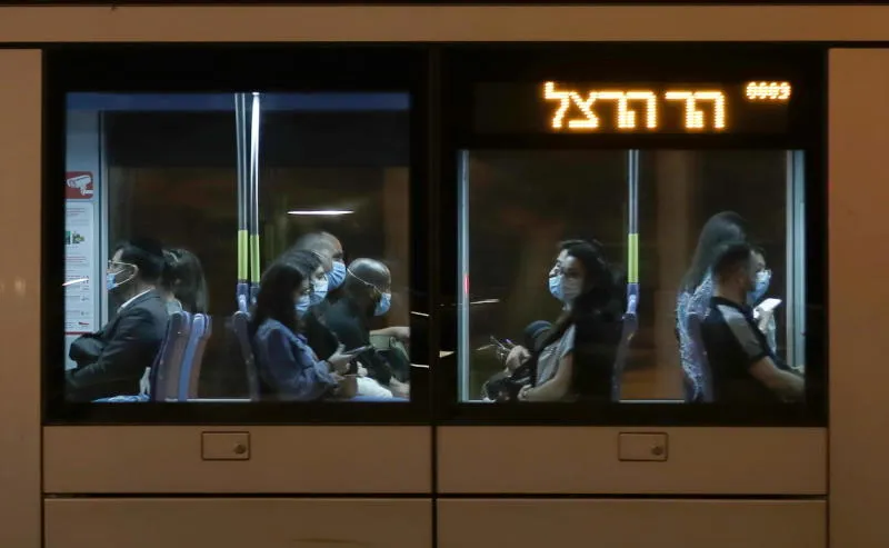 إسرائيليون يرتدون الأقنعة على متن حافلة في القدس (إ.ب.أ)