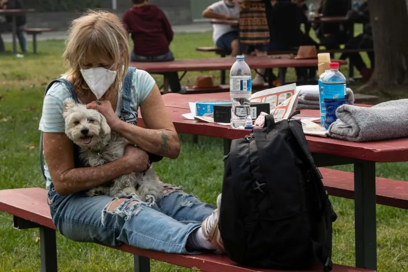 سيدة أميركية تحمل كلبها في ولاية أوريغون (أ.ف.ب)