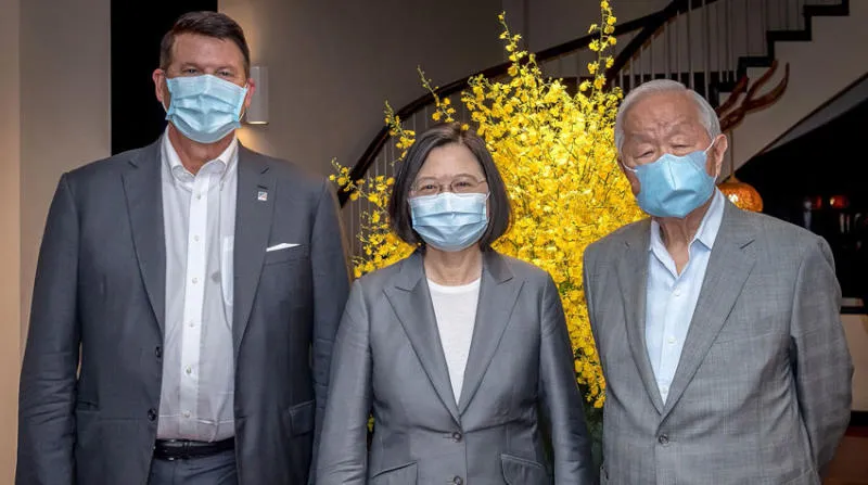 رئيسة تايوان (وسط) مع الضيف الأميركي كاش (يسار) ورجل الأعمال التايواني مصنّع رقائق الكمبيوتر (أ.ف.ب)