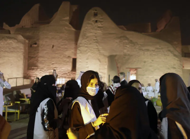 مرشدة سياحية سعودية ترتدي قناعاً واقياً أمام قصر سلوى التاريخي في الدرعية (أ.ب)