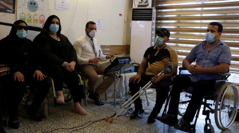 عراقيون يرتدون كمامات خلال الاستماع إلى ضرير يعزف على آلة موسيقية أمام أعضاء في تحالف المعوقين في بغداد في وقت سابق هذا الشهر (رويترز)