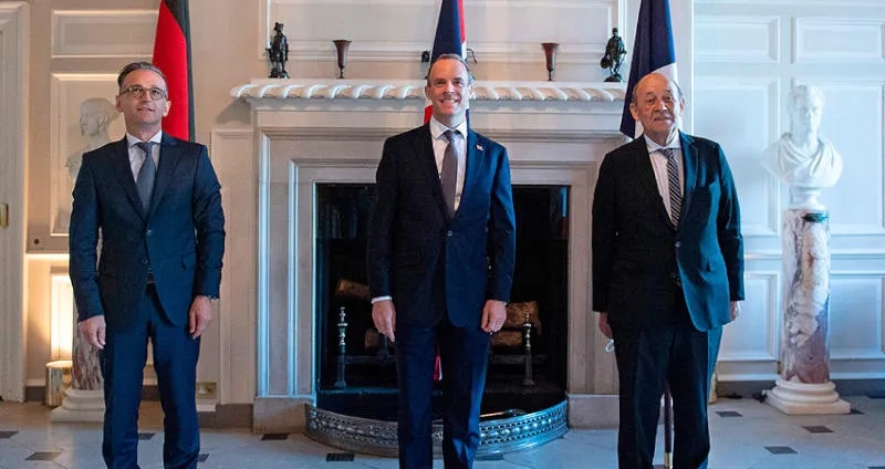 وزير الخارجية البريطاني دومينيك راب ونظيراه الألماني هايكو ماس والفرنسي جان إيف لودريان خلال مشاورات في لندن الشهر الماضي (أ.ف.ب)