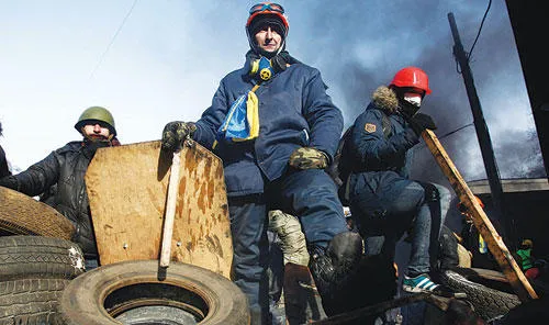 معارضون أوكرانيون بعد يوم من المصادمات بين الشرطة والمحتجين الذين حاصروا مبنى في وسط كييف أمس (رويترز)