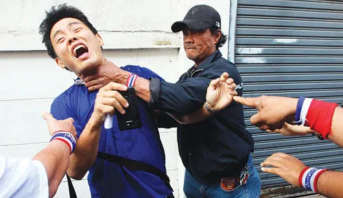 محتج تايلاندي يهاجم مواطن ذهب للتصويت المبكر في انتخابات العاصمة بانكوك أمس (إ.ب.أ)