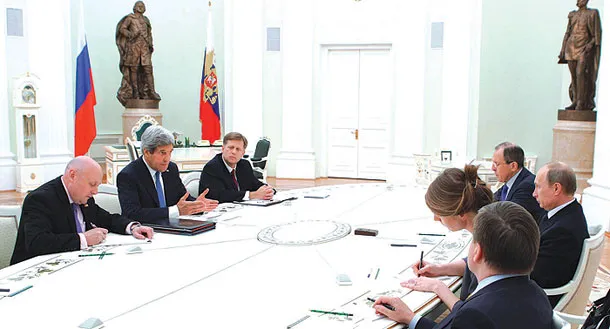 فيما اعتبر أنه محادثات الفرصة الأخيرة أمام الحل السياسي، التقى وزير الخارجية الأميركي جون كيري، يرافقه وفد يتضمن سفير الولايات المتحدة لدى سوريا روبيرت فورد، الرئيس الروسي فلاديمير بوتين لبحث الأزمة السورية، في ظل تزايد الضغوط الداخلية على الرئيس الأميركي باراك أوباما لتسليح المعارضة السورية الساعية لإسقاط نظام الرئيس بشار الأسد.