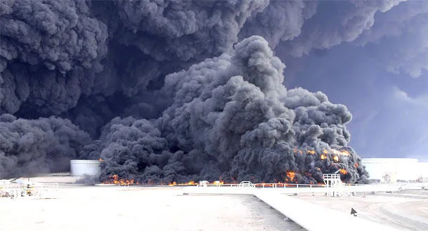 واندلعت النار في أول صهريج الخميس جراء قذيفة صاروخية أطلقتها مليشيات "فجر ليبيا" الإسلامية من زورق بحري باتجاه المرفأ، ثم امتدت الى الخزانات المجاورة. وباتت النيران مشتعلة الآن في سبعة خزانات، من أصل 19 خزانا في منطقة "فارم تانك"، وفق مسؤول تقني في شركة الواحة للنفط التي تدير المرفأ.