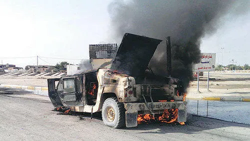 الدخان يتصاعد من عربة عسكرية بعد أن هاجمها مسلحون في الفلوجة أمس (أ.ف.ب)