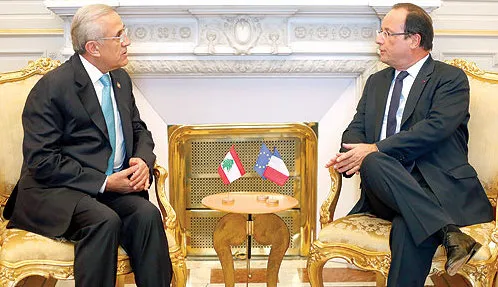 الرئيس الفرنسي فرنسوا هولاند لدى لقائه الرئيس اللبناني ميشال سليمان قبل بدء دورة الالعاب الفرانكفونية السابعة في نيس أمس (أ.ب)
