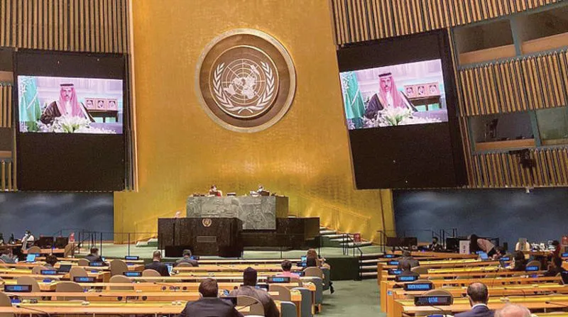 الأمير فيصل بن فرحان لدى إلقاء كلمته في الاجتماع الرفيع المستوى الذي نظمته الأمم المتحدة عبر وسائل الإعلام المرئي للاحتفال باليوم الدولي للإزالة الكاملة للأسلحة النووية (واس)
