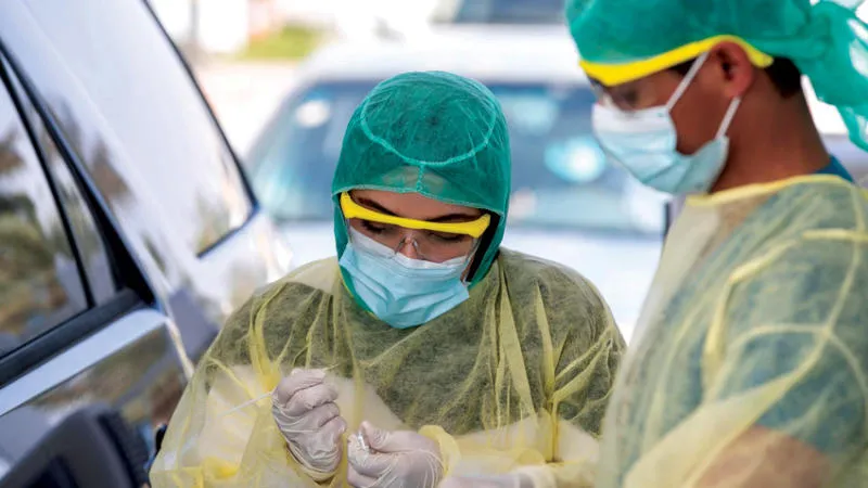 موظفون صحيون أثناء أخذ مسحات لاختبار الإصابة بـ{كورونا} (الشرق الأوسط)