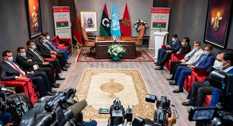 جانب من اجتماعات طرفي النزاع الليبي في بوزنيقة المغربية لإيجاد توافقات تنهي الأزمة الليبية (أ.ف.ب)