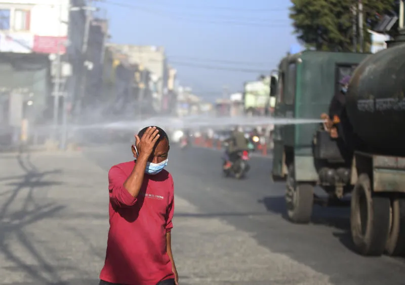 رجل يرتدي كمامة للحماية من فيروس «كورونا» يمشي مقابل شاحنة تقوم برش مواد معقمة في شوارع نيبال (أ.ب)