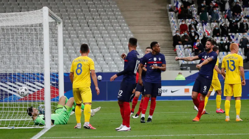 جيرو تخطى بلاتيني في قائمة هدافي فرنسا بهدفين في الانتصار الساحق على أوكرانيا الأربعاء (أ.ب)