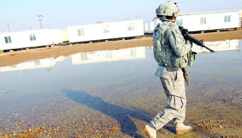 جندي أميركي داخل مجمع قاعدة تاجي أمس حيث يتدرب العراقيون لمحاربة {داعش} (أ.ف.ب)