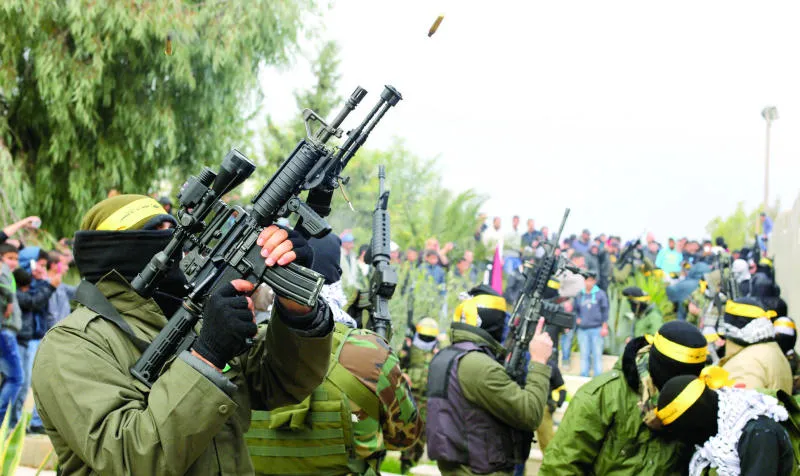 مسلحون من «كتائب شهداء الأقصى» الجناح العسكري لفتح يطلقون النار في احتفال بالذكرى الـ50 لفتح في مخيم قلنديا (أ.ف.ب)