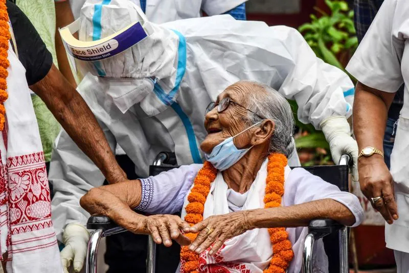 ممرض يرتدي الملابس الواقية يتحدث إلى مسنّة أصيبت بكورونا في الهند (أ.ف.ب)