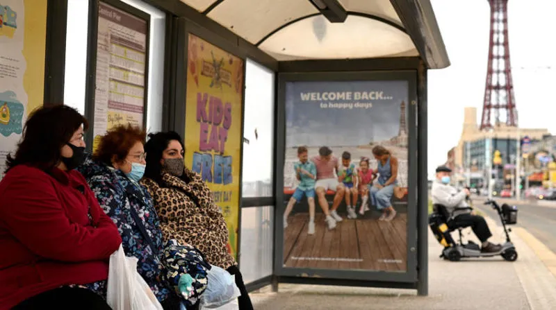 نسوة بكمامات للوقاية من «كورونا» عند موقف للحافلات في مدينة بلاكبول الإنجليزية أمس (أ.ف.ب)