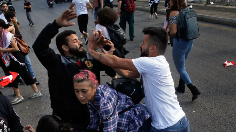 مواجهة بين مؤيد لـ«حزب الله» (يمين) ومشارك في احتجاجات ضد الحكومة اللبنانية في بيروت العام الماضي (أ.ب)
