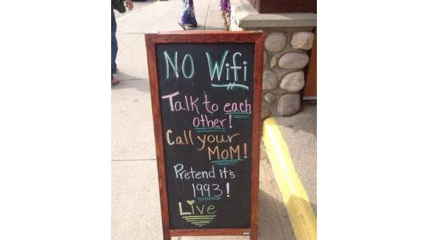 وتتلخص فكرة المطعم في لوحة كتب عليها بخط كبير "لا انترنت لاسلكي" (واي فاي). وتحتها كتب "تبادل الحديث مع شخص آخر. اتصل بوالدتك. تخيل أنك في عام 1993".