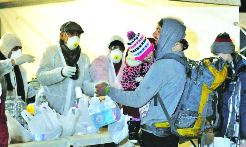 مهاجر يحمل رضيعا ويتلقى مساعدات غذائية بعد نزوله من السفينة «عز الدين» في مرفأ كوريليانو الإيطالي أمس (إ.ب.أ)