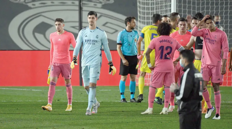 لاعبو ريال مدريد بعد الهزيمة من قادش الصاعد في المرحلة الماضية (أ.ف.ب)