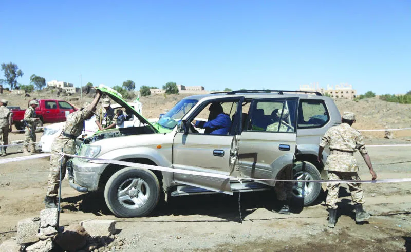 عناصر من جماعة الحوثي يفتشون سيارة أثناء أحد الاحتفالات في صنعاء (رويترز)