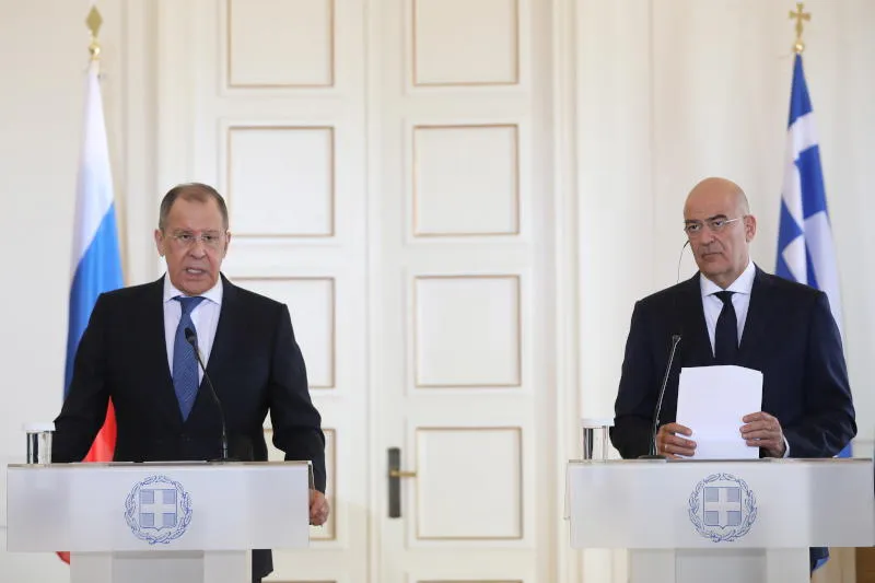 وزير الخارجية الروسي سيرغي لافروف (يسار) ونظيره اليوناني نيكوس ديندياس (إ.ب.أ)