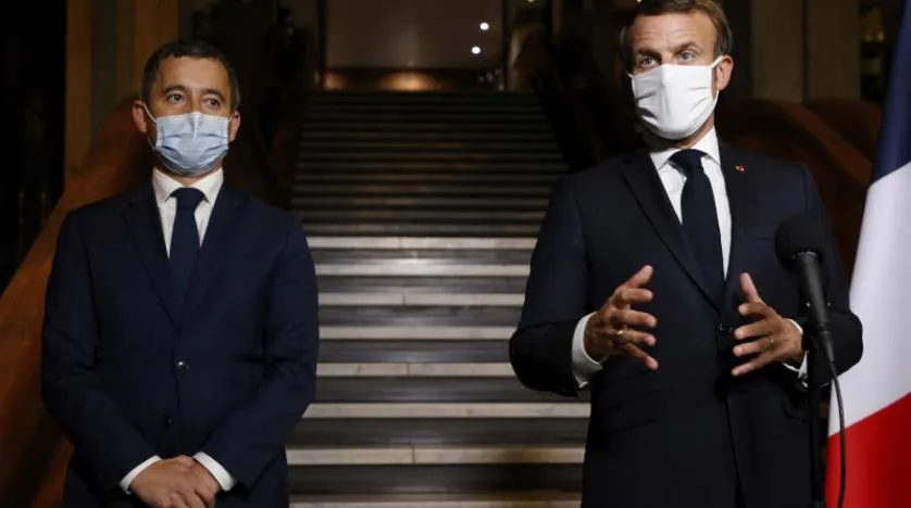الرئيس الفرنسي إيمانويل ماكرون (يمين) ووزير الداخلية الفرنسي جيرالد دارمانان في مؤتمر صحافي (أ.ب)