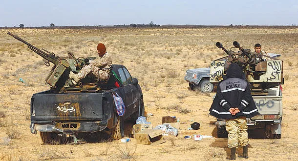 ميليشيات من «فجر ليبيا» لدى اشتباكات بينهم وبين قوات تابعة للجيش الليبي بالقرب من قاعدة الوطية غرب العاصمة طرابلس أمس (أ. ف. ب)