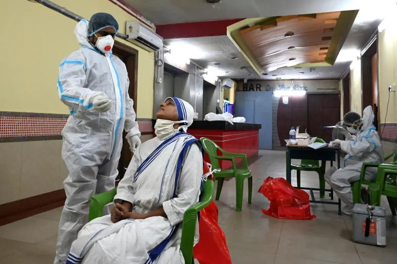 عاملة بالقطاع الطبي تقوم بإجراء اختبار «كورونا» لإحدى الراهبات في الهند (أ.ف.ب)