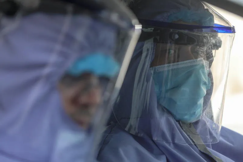 موظفون يرتدون الأقنعة الواقية في غزة (إ.ب.أ)