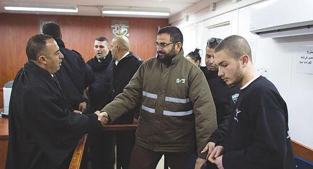 حسام القواسمة يصافح يد محاميه خلال جلسة محاكمته في محكمة أوفر بالقرب من رام الله أمس (رويترز)