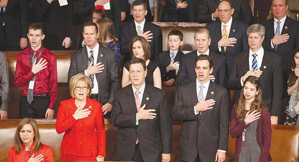 أعضاء في مجلس النواب، بعضهم رفقة عائلاتهم، يؤدون قسم الولاء لدى افتتاح الدورة الـ114 من دورات الكونغرس في «الكابيتول هيل» أمس (أ.ب)