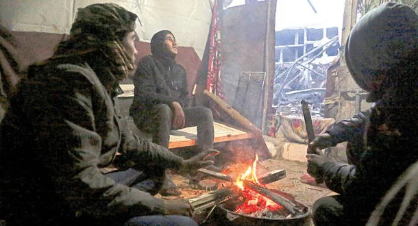 عائلة فلسطينية توقد النيران في منزلها بغزة طلبا للدفء بعد العاصفة الثلجية التي ضربت الأراضي الفلسطينية أمس (أ.ب)