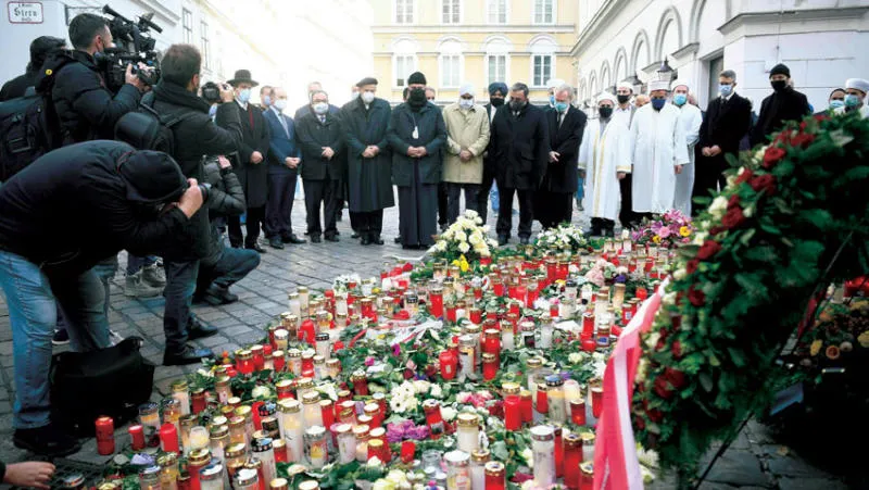 ممثلو الطوائف الدينية في النمسا شاركوا أمس في مسيرة لإحياء ذكرى ضحايا هجوم إرهابي سقط فيه 4 ضحايا بالعاصمة فيينا الاثنين الماضي (أ.ف.ب)