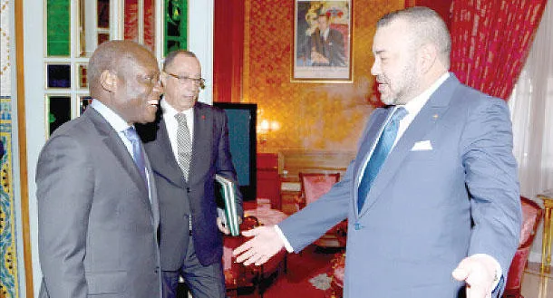 الملك محمد السادس لدى استقباله رئيس جمهورية غينيا بيساو خوسي ماريو فاز الذي يقوم بزيارة خاصة للمغرب وذلك بالقصر الملكي في الدار البيضاء أمس (ماب)