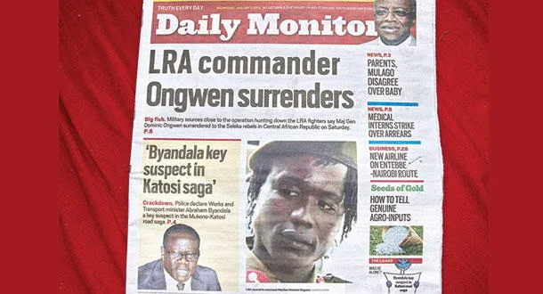 صحيفة أوغندية تضع على صفحتها الأولى خبر استسلام قيادي جيش الرب دومينيك أونغوين أمس (أ.ف.ب)