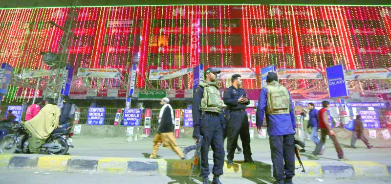 قوات الأمن الباكستانية أمام مركز حفيظ التجاري للأجهزة الإلكترونية والجوال في لاهور بسبب مخاوف من تعرضه لهجوم إرهابي (إ.ب.أ)