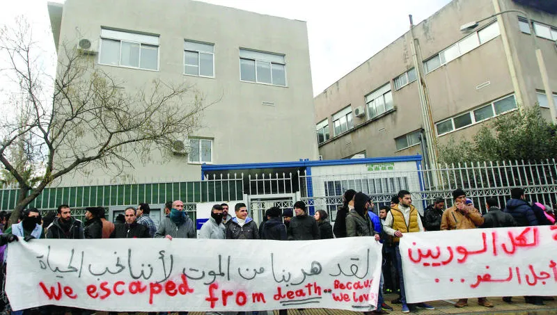 لاجئون من سوريا ودول أخرى ينتظرون خارج قسم اللجوء بأثينا للبت في أوضاعهم ويخاطر آلاف اللاجئين بأنفسهم في البحر للوصول إلى أوروبا عبر اليونان (إ.ب.أ)