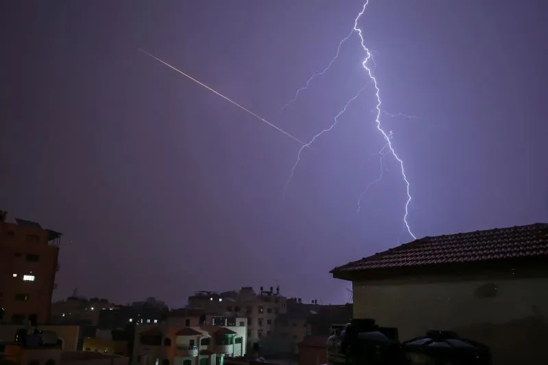 وميض فوق عدد من المباني في غزة حيث تم إطلاق صاروخ من مكان قريب خلال عاصفة رعدية في سماء القطاع (أ.ف.ب)