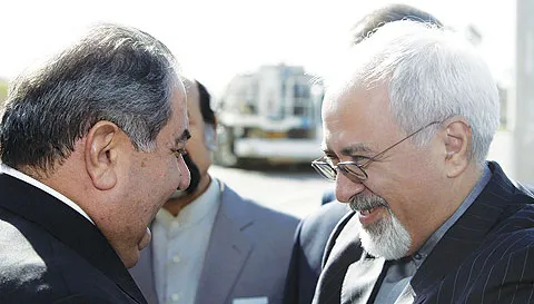 وزير الخارجية العراقي هوشيار زيباري مستقبلا نظيره الإيراني محمد جواد ظريف في مطار بغداد الدولي أمس (أ.ف.ب)