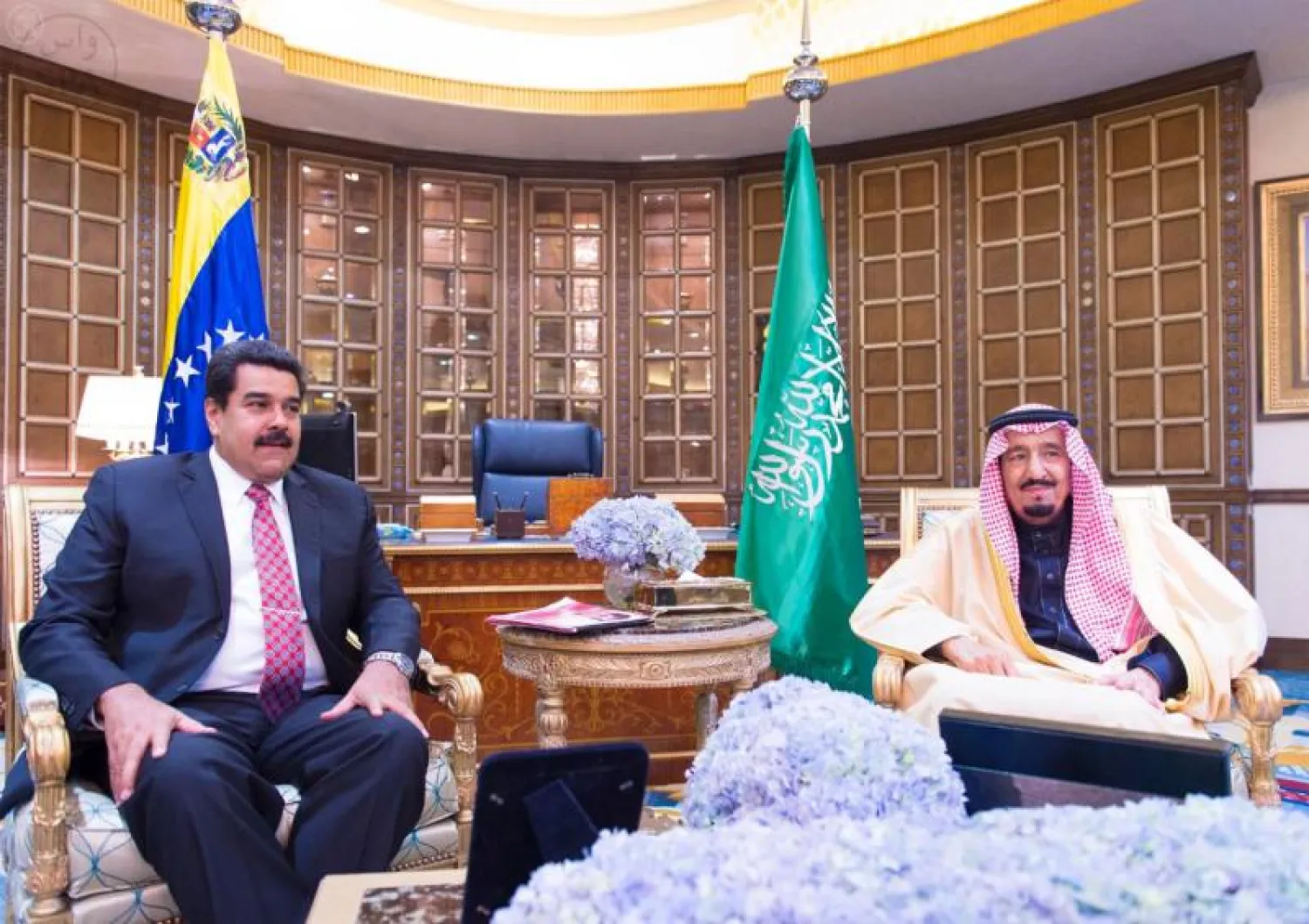 وكان ولي العهد الأمير سلمان أقام مأدبة غداء احتفاء بالرئيس نيكولاس مادورو موروس رئيس جمهورية فنزويلا بمناسبة زيارته الحالية للمملكة، في قصره بالرياض اليوم نيابة عن خادم الحرمين الشريفين الملك عبد الله بن عبد العزيز.