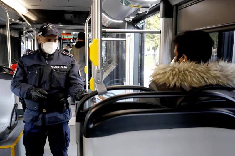 شرطي إيطالي يقوم بعملية تفتيش على حافلة وسط طوارئ بسبب جائحة كورونا في مدينة ميلانو (إ.ب.أ)
