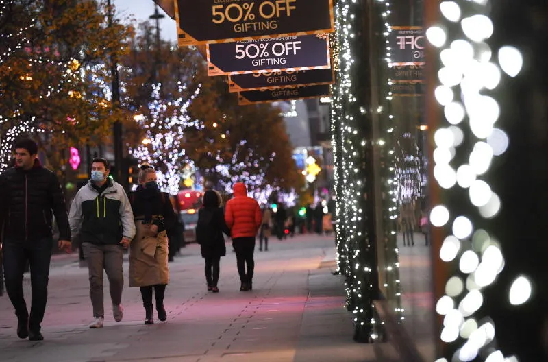 متسوقون يمرون أمام نوافذ المتاجر المزينة بهدايا عيد الميلاد بشارع أكسفورد في لندن (إ.ب.أ)